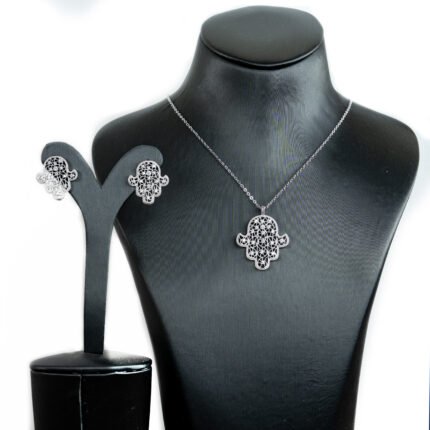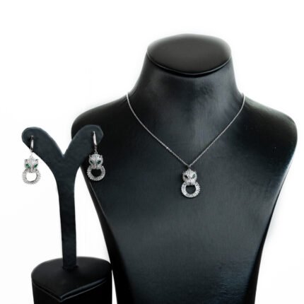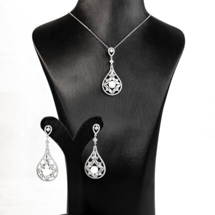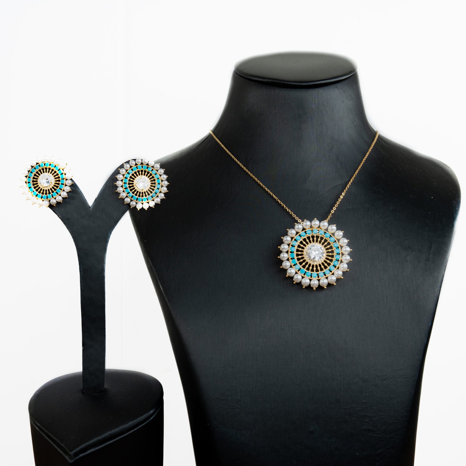 Necklace and earrings with a luxurious circular design featuring pearl accents and turquoise details, with long-lasting color plating and sparkling zircon stones for a radiant and royal look that stands out.