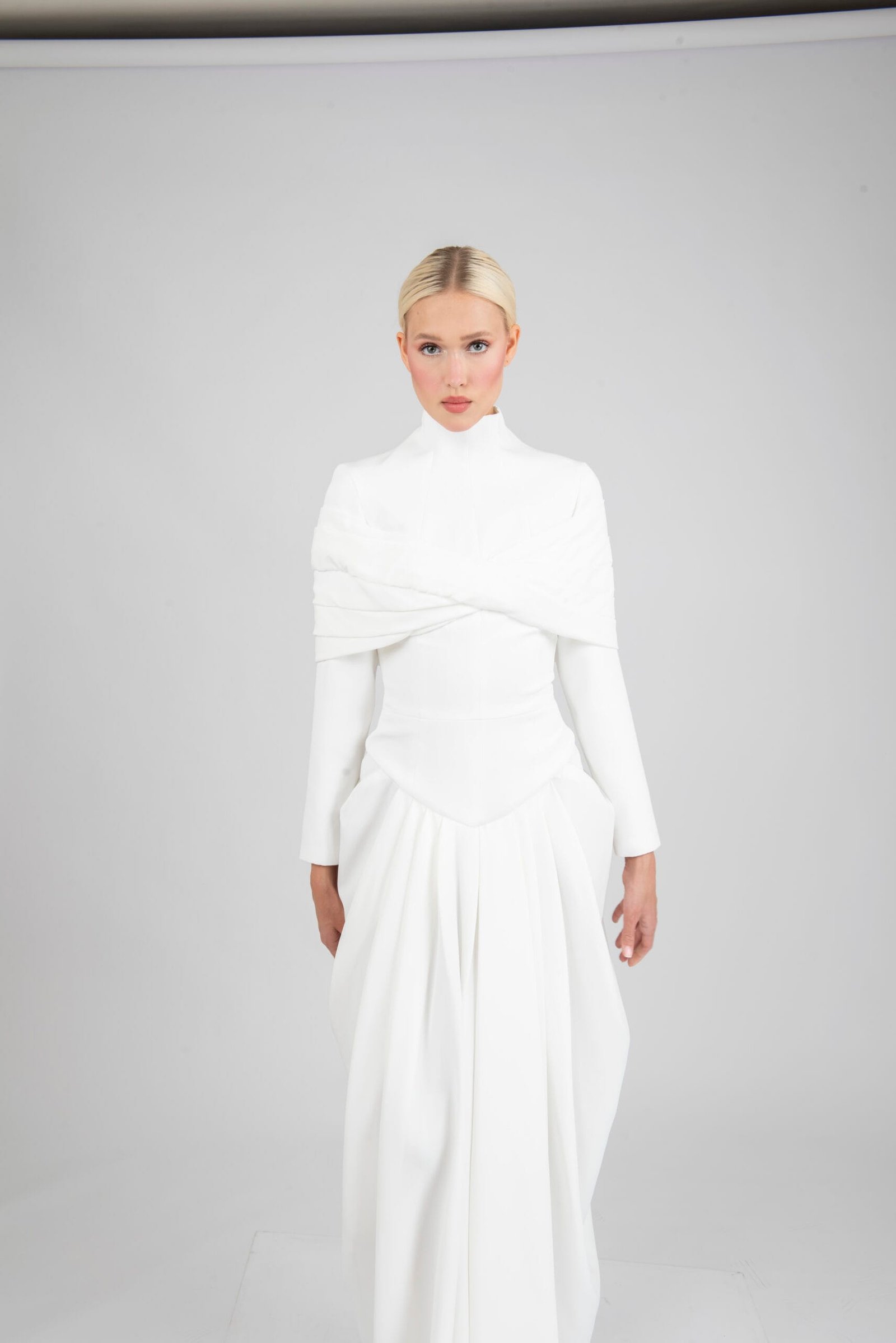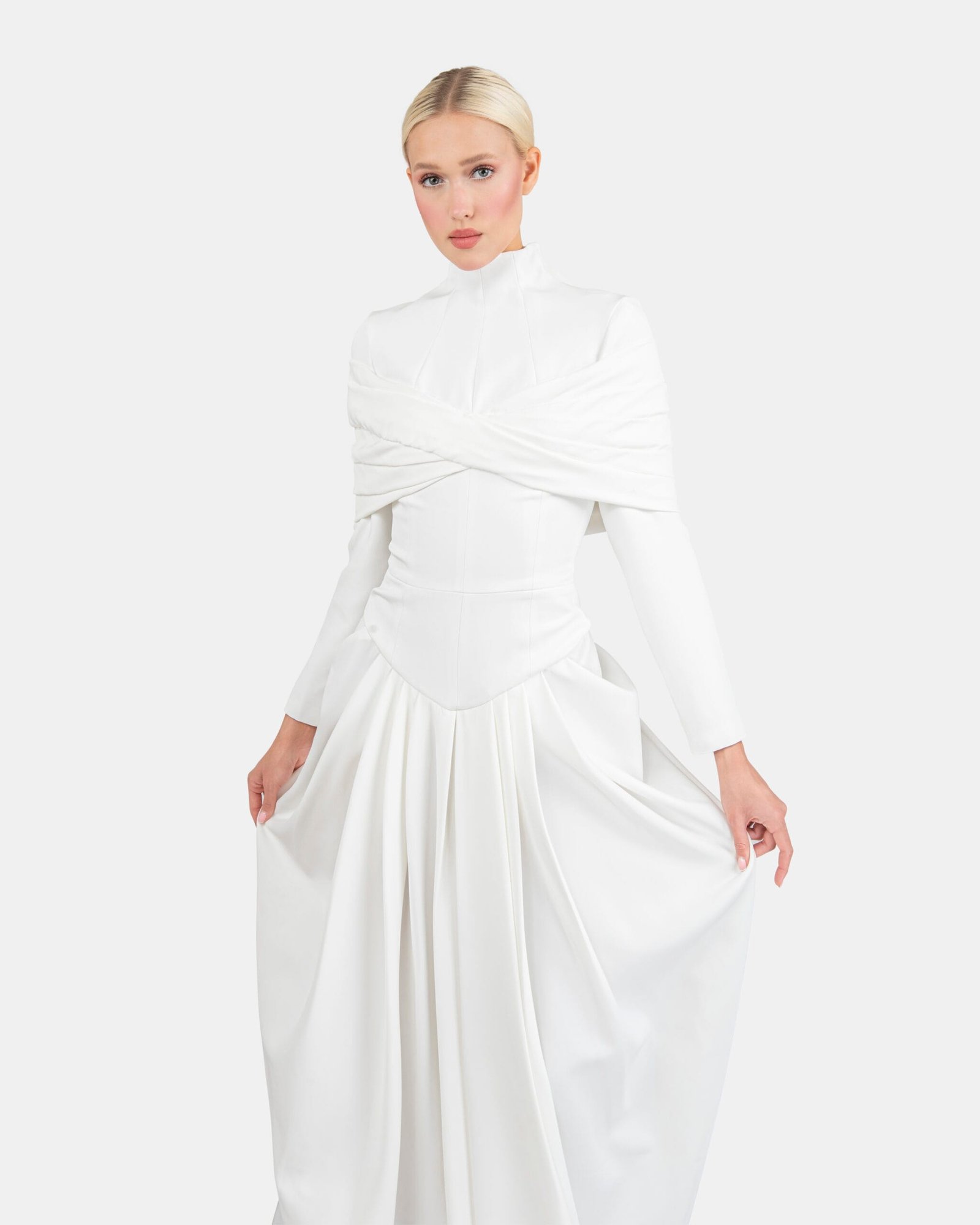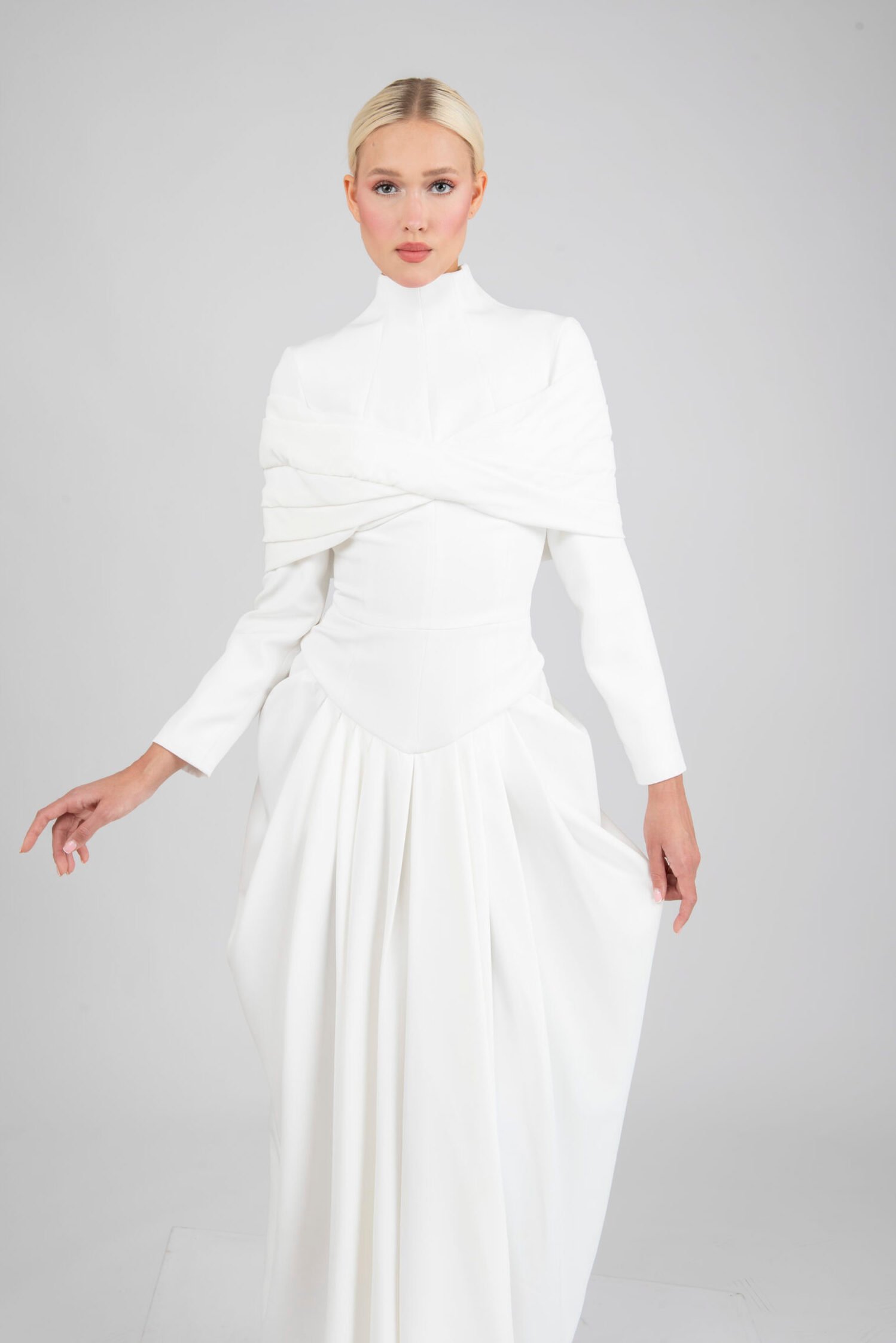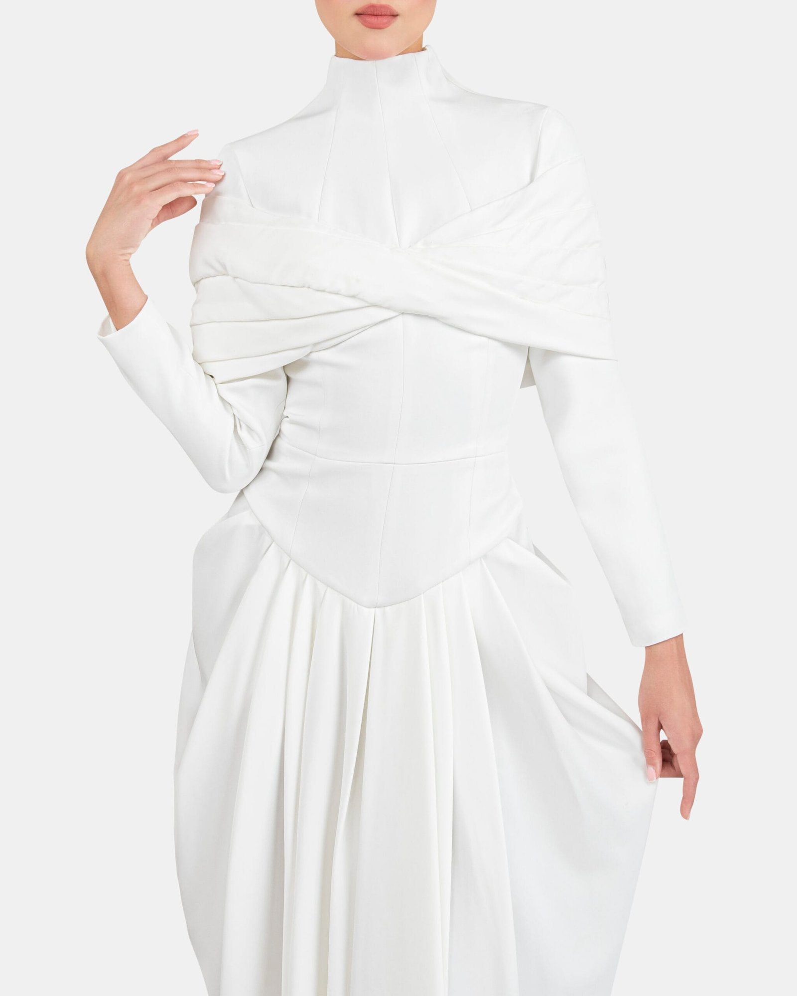 Crepe gown with a high neckline and gathered draping across the bodice
