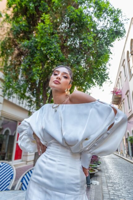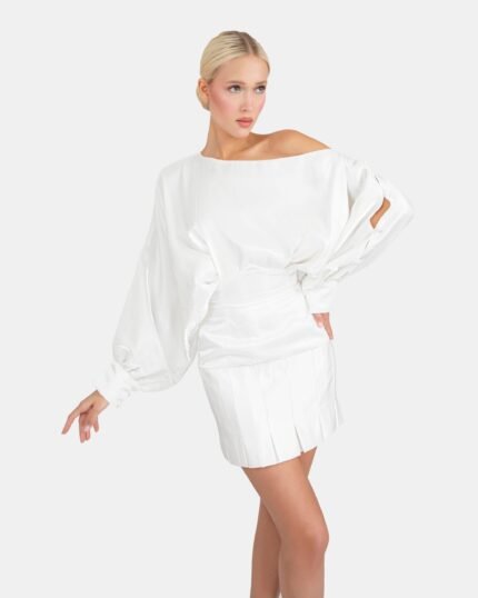 Sheer nude mesh top with white floral lace embroidery, styled with a flounced high waisted satin mini skirt