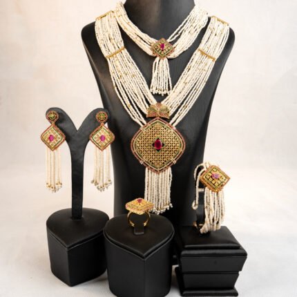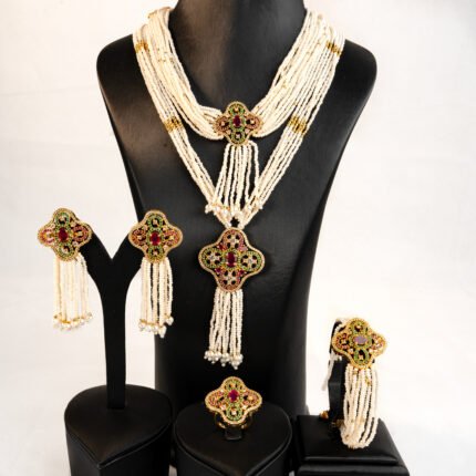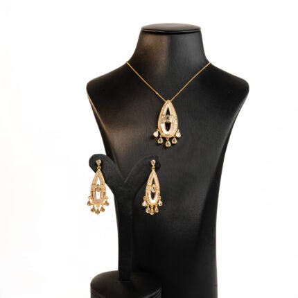 Necklace and earrings with an elegant pearl design, featuring long-lasting color plating and sparkling zircon stones for a refined shine and a classy feminine look on every occasion.