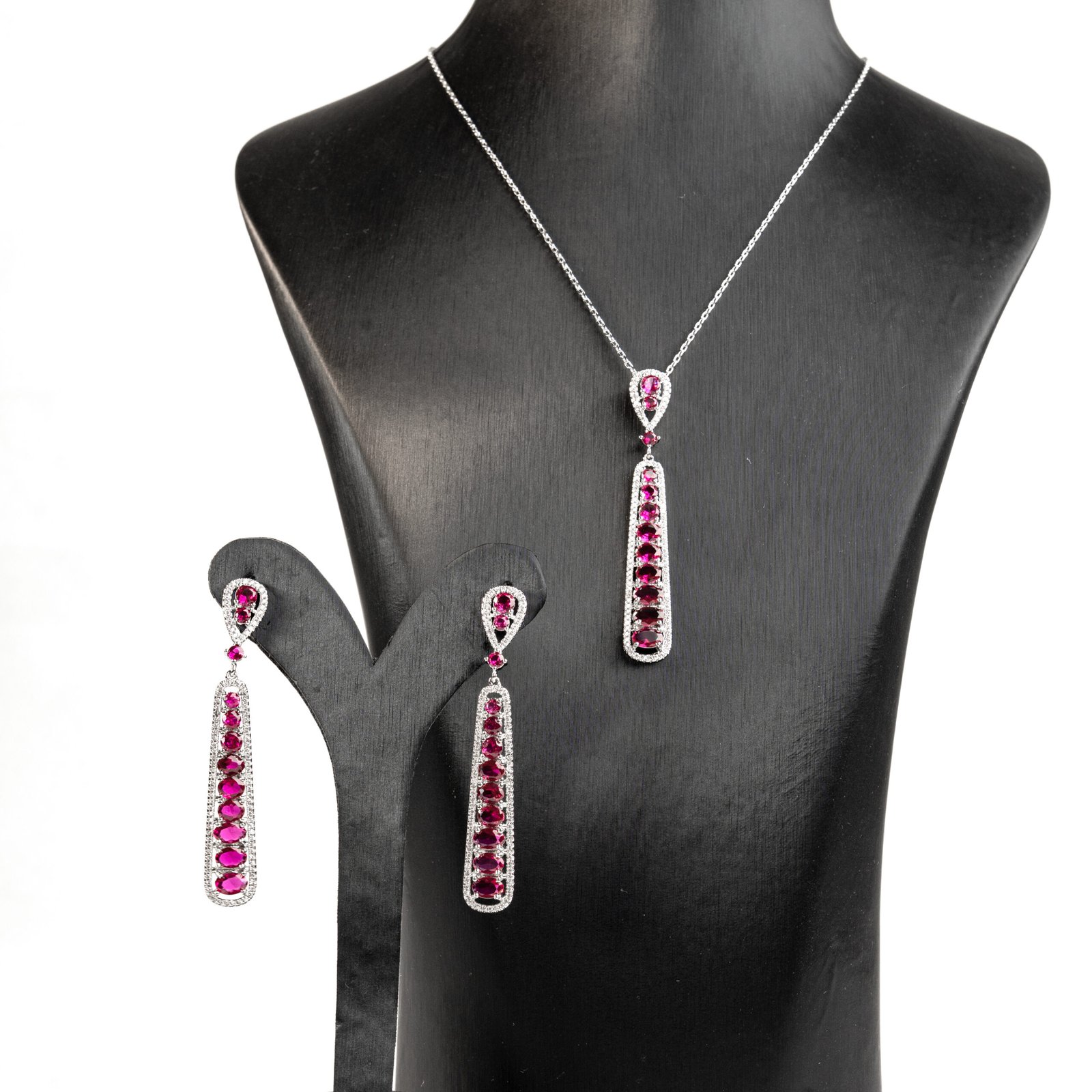 Luxury silver jewelry set for women, necklace and earrings with sparkling fuchsia zircon.